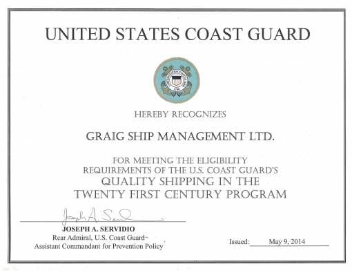 Graig-managed vessels have again met the eligibility requirements of the US Coast Guard’s QUALITY SHIPPING IN THE TWENTY FIRST CENTURY PROGRAM (QUALSHIP21).